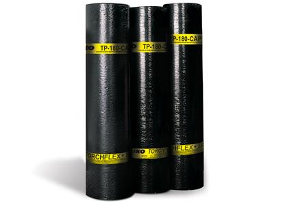 Produced to a nominal thickness of 5.0 mm, this product is composed of a non-woven, reinforced polyester mat which has been coated and permeated with SBS modified bitumen. Ceramic granules are embedded in the surface to provide UV protection and a light poly-film is bonded to the underside (which disappears upon heat-welding). TP-250-CAP (5.0 mm) can be used as the top ply in a two-ply Torchflex system or in flashing installation.