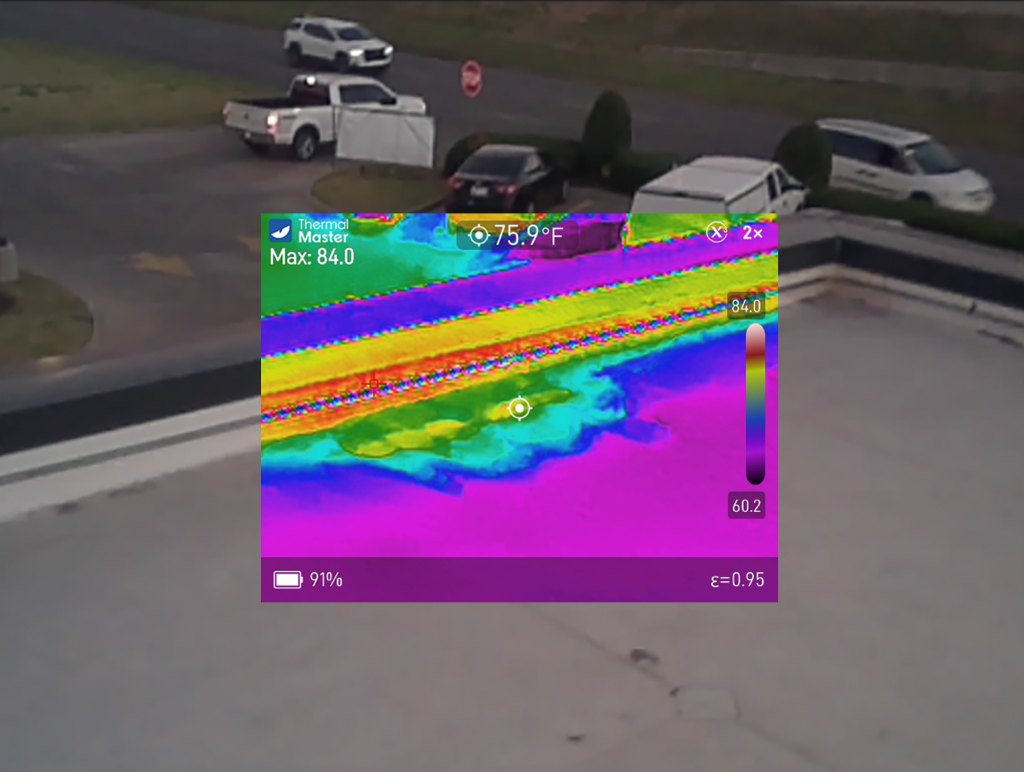 Our thermal imaging located this moisture intrusion on a local OKC restaurant, which is showing moisture intrusion into the insulation board.